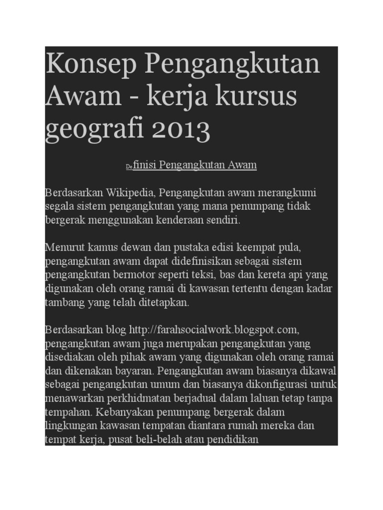 Maksud pengangkutan awam menurut kamus dewan edisi keempat. Pengangkutan boleh didefinisikan sebagai suatu konsep cara pemindahan daripada suatu tempat ke tempat yang lain kamus dewan bahasa dan pustaka 2007. Pengangkutan awam atau transit awam merangkumi segala sistem pengangkutan yang mana penumpang tidak bergerak menggunakan kenderaan sendiri. Menurut kamus dewan dan pustaka edisi keempat pula pengangkutan dapat didefinisikan sebagai pembawaan barang barang dari satu tempat ke tempat yang lain. Pengangkutan terbahagi kepada beberapa jenis iaitu pengangkutan melalui jalan darat pengangkutan melalui jalan air dan pengangkutan melalui jalan udara.