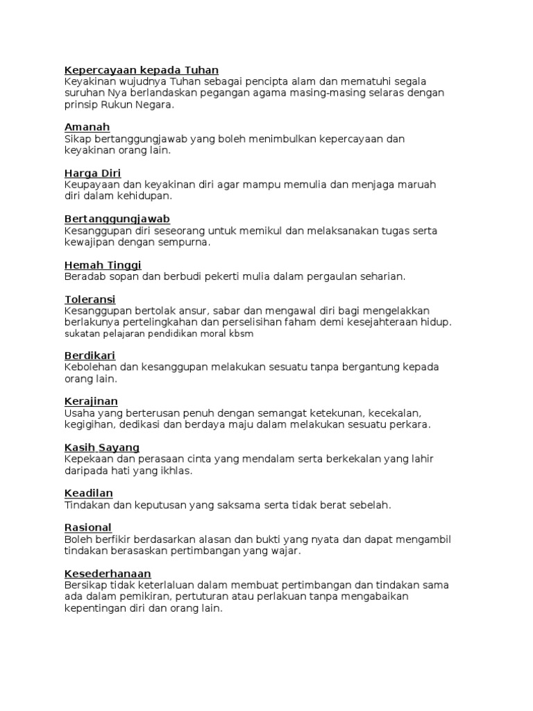 Nilai moral senarai nilai nilai murni. Pendidikan moral adalah satu subjek yang mengajar tentang penerapan nilai nilai murni dalam diri untuk diaplikasikan dalam kehidupan seharian. السلام عليكم ورحمة الله وبركاته inshaallah. Pusat perkembangan kurikulum ppk telah memperakui 16 nilai nilai murni. 1 1 rasional boleh berfikir berdasarkan alasan dan bukti yang nyata mampu membuat pertimbangan.