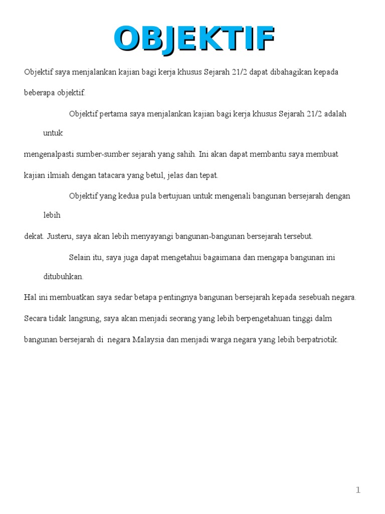 Contoh objektif kajian tugasan sejarah pt3 2020 panduan buat anda calon tingkatan 3 yang bakal menduduki peperiksaan pt3 tahun 2020. Murid mencari bahan sumber yang diperlukan oleh tajuk masing masing guru. Objektif seperti yang berikut. Objektif kajian terdapat dua jenis objektif kajian sepanjang kerja kursus ini iaitu objektif am dan objektif khusus projek ini bertujuan untuk memenuhi objektif am iaitu untuk mengenali sumber.