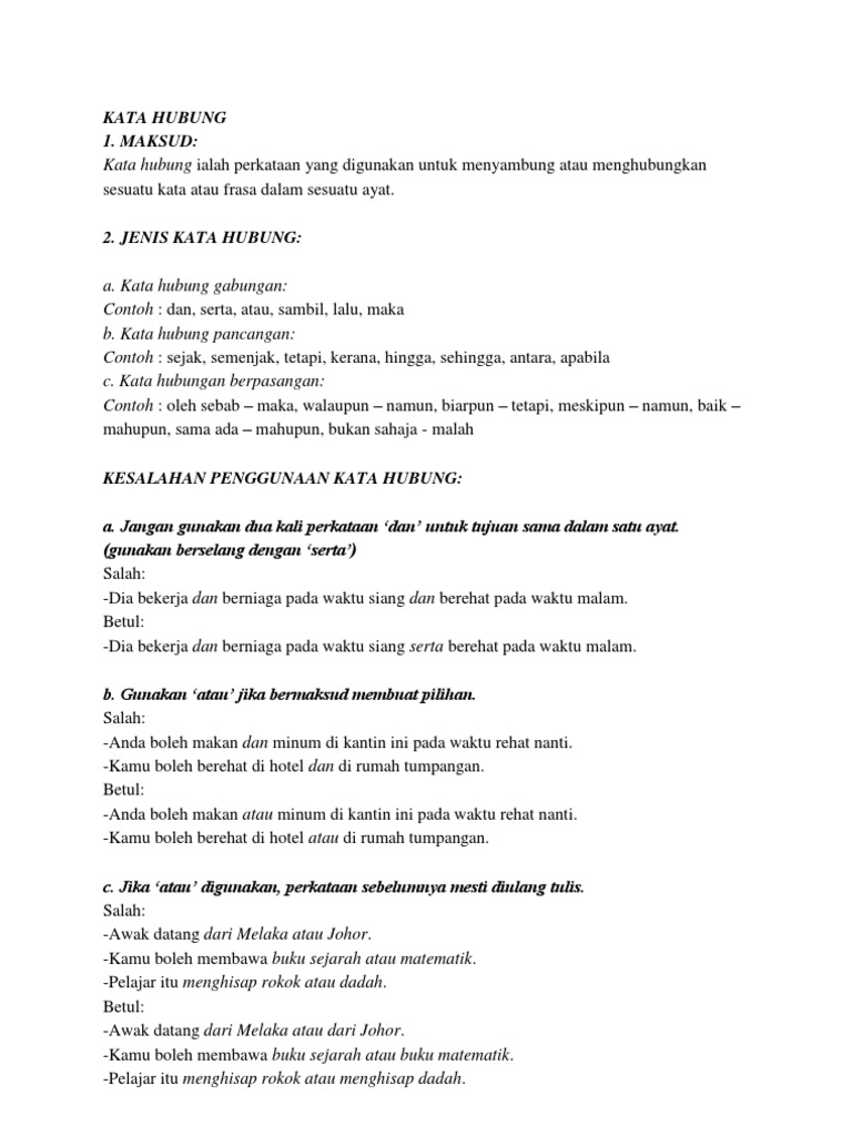 Begitu juga dengan ayat ayat contoh yang menggunakan oleh sebab. Oleh kerana sangat biasa digunakan. Melainkan nyatakan empat sebab mengapa kamu tidak datang. Perkataan kerana ialah kata hubung bukan kata nama manakala kata sebab mempunyai dua fungsi iaitu sebagai kata nama dan kata hubung.