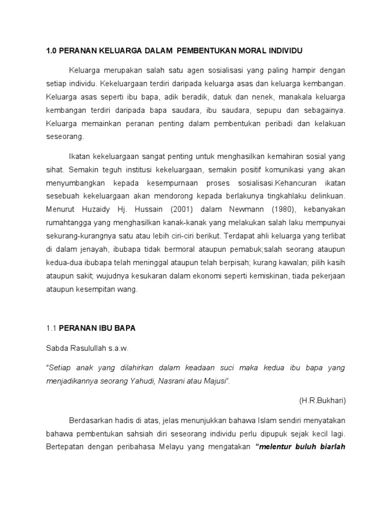 Peranan ibu bapa dalam keluarga kembangan. Ibu bapa haruslah berperanan untuk memberikan didikan agama dan moral kepada anak anak. Dalam suatu penyelidikan di amerika menyimpulkan bahwa ketidak hadiran bapak dalam keluarga membawa akibat yang sangat fatal bagi perkembangan hidup anak anaknya tidak ada bedanya dengan peranan seorang ibu dalam keluarga. Peranan ibu bapa dalam membentuk keluarga bahagia pendahuluan. Pelbagai masalah sosial saban hari media massa melaporkan berita jenayah salah laku keruntuhan moral terdapat banyak faktor yang menyumbang kepada kebejatan sosial yang menjadi duri dalam daging dalam masyarakat salah satu faktor ialah latar belakang keluarga keluarga ialah institusi unit masyarakat yang yang terdiri.