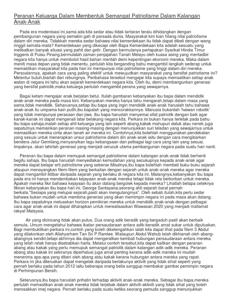 Peranan ibu bapa dalam memupuk semangat patriotik. Semangat patriotik semakin luntur dalam kalangan remaja pada masa ini. Selain itu pihak yang bertanggungjawab hendaklah menjalankan kempen secara besar besaran dalam memupuk semangat patriotik antara masyarakat. Membuat kesimpulan lagi terang lagi bersuluh bahawa kepentingan peranan ibu bapa dalam pemupukan semangat patriotik dalam lubuk kalbu anak anak tidak dapat dinafikan. Jelaskan peranan ibu bapa dalam menerapkan semangat patriotik dalam jiwa anak anak.