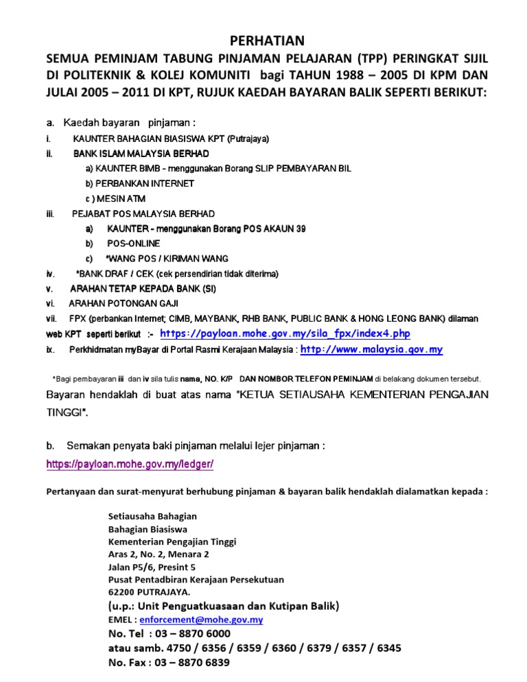 Akept akademi kepimpinan pendidikan tinggi. Pejabat ketua pengarah pendidikan tinggi aras 9 no. Sambungan sila buat panggilan ke 03 8870 6000 dan maklumkan no. Pembukaan semula sistem semakan penyata dan bayaran balik pinjaman pelajaran fpx bahagian biasiswa dan pembiayaan kementerian pengajian tinggi sebarang pertanyaan lanjut boleh dikemukakan melalui e mel enforcement moe gov my atau di talian 03 8888 6787.