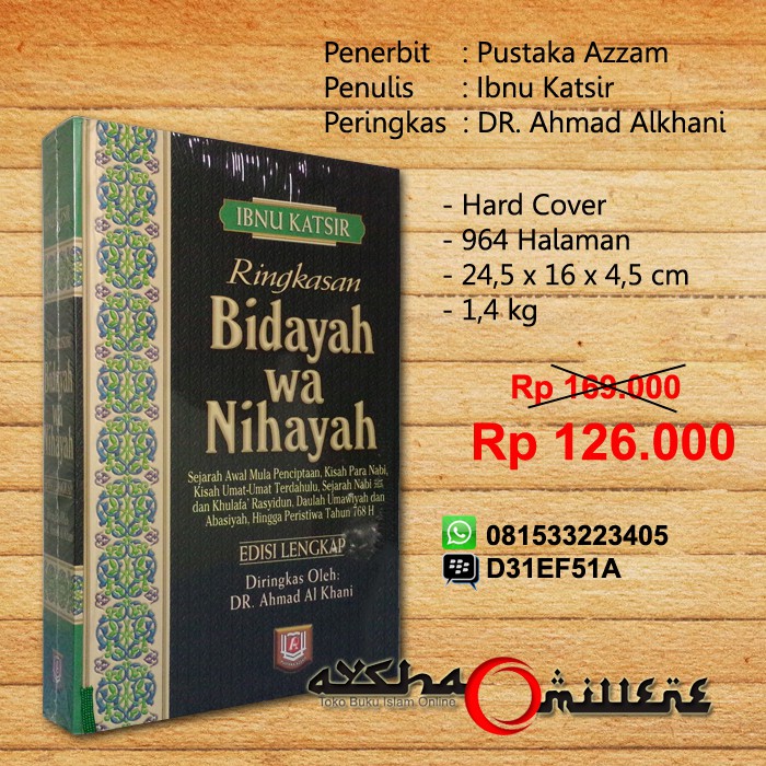 16 x 25 cm tebal. Kitab terjemah al bidayah wa an nihayah ini menjadi pintu masuk berbagai dekade penulisan sejarah dimana kitab al bidayah wa an nihayah ini ditulis pada akhir abad ke 8 hijriyah. Adapun kitab al bidayah wan nihayah sendiri merupakan sebuah buku ensiklopedi sejarah terbesar yang didalamnya memuat berbagai macam disiplin ilmu dan berbagai bentuk permasalahan yang menggambarkan betapa luas wawasan keilmuan pengarangnya. Buku ini buku mukhtashar al bidayah wa an nihayah ibnu katsir buku ringkasan al bidayah wan nihayah merupakan karya besar dari al hafizh ibnu katsir rahimahullah yang menghimpun ratusan peristiwa bersejarah mengenai asal mula terciptanya sesuatu dan pecahnya suatu peristiwa.