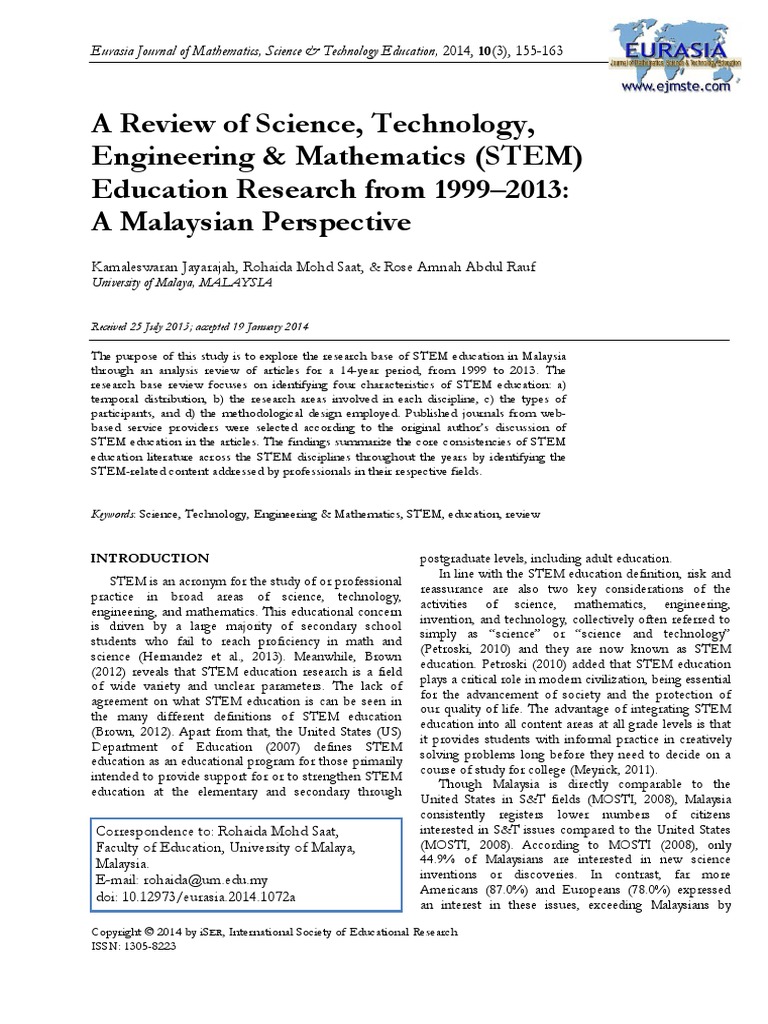 Eurasia journal of mathematics science and technology education vol. Science technology engineering and mathematics stem this strand is designed for students who desire to pursue college degrees centered on science technology engineering and mathematics stem. A review of science technology engineering mathematics stem education research from 1999 2013. University technology malaysia utm.