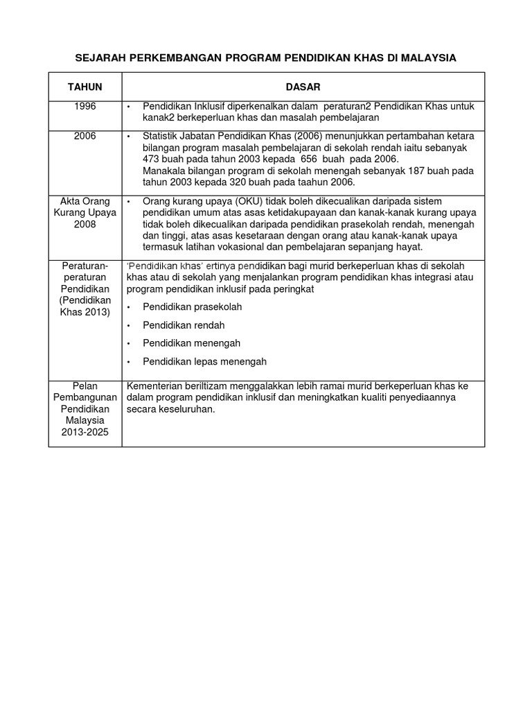 Sekolah khas ipoh 1966 sekolah khas sarawak 1972 sekolah khas melaka. Tahun 1988 kementerian pendidikan malaysia telah memulakan kelas perintis untuk murid murid peringkat rendah bermasalah pembelajaran dan seterusnya ke suluruh negara. Mansor 2005 program pendidikan khas di malaysia merupakan satu usaha yang berterusan bagi menggalakkan perkembangan optima seseorang sebagai seorang yang berkemahiran berhaluan berupaya beriman berdikari mampu merancang dan menguruskan kehidupan serta menyedari potensi diri sebagai seorang individu dan ahli masyarakat yang seimbang dan produktif selaras dengan falsafah pendidikan negara. Minat terhadap pendidikan khas di malaysia bermula pada tahun 1920an di kalangan sukarelawan yang terlibat dalam pembukaan sekolah sekolah cacat penglihatan dan pendengaran.