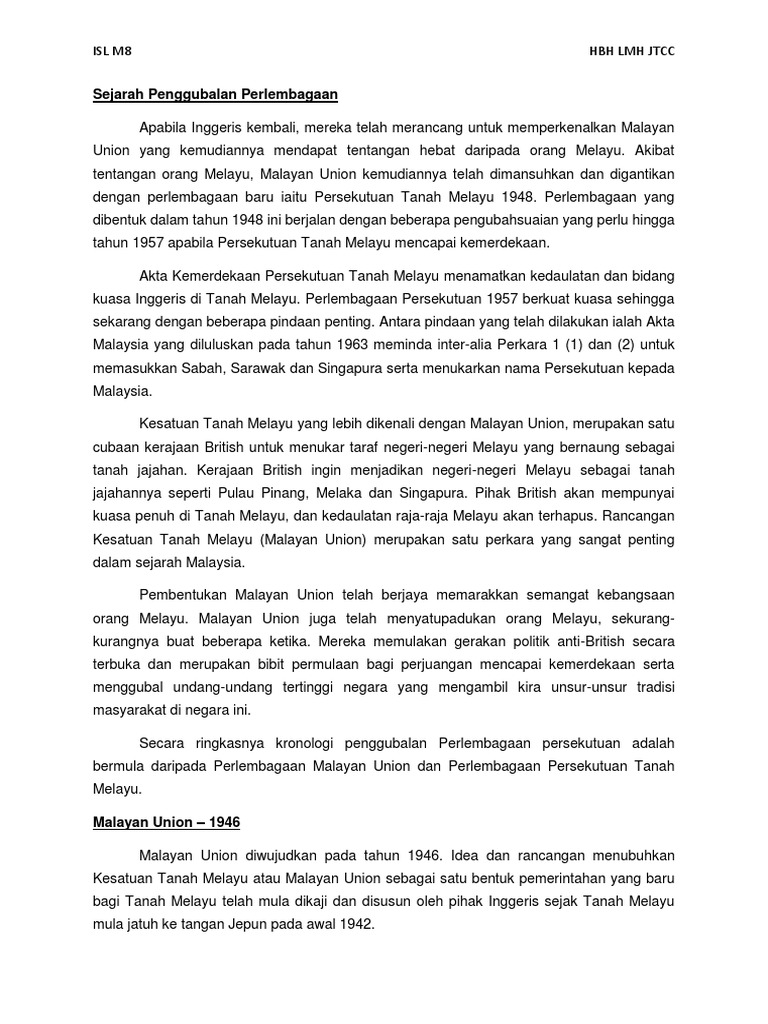 Sejarah penggubalan perlembagaan persekutuan di malaysia sehingga tahun 1957. Sejarah perlembagaan moden malaysia bermula pada akhir abad ke 19 ketika kerajaan british menguasai tanah melayu. Penggubalan perlembagaan persekutuan. Perlembagaan persekutuan atau perlembagaan malaysia sebenarnya telah dipinda lebih dari sekali. Antara pindaan yang telah dilakukan ialah akta malaysia yang diluluskan pada tahun 1963 meminda inter alia perkara 1 1 dan 2 untuk memasukkan sabah sarawak dan singapura serta menukarkan nama persekutuan kepada malaysia.