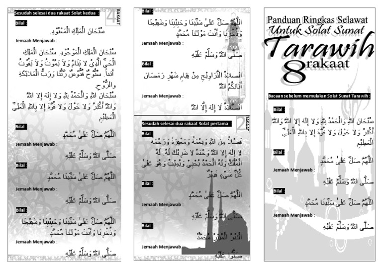 Terdiri dari 8 rakaat solat tarawih dan 3 rakaat solat sunat witir. Oleh kerana jumlah rakaat adalah 8 rakaat dan ditunaikan sebanyak 4 kali solat satu salam bagi setiap 2 rakaat maka bacaan ditanda dengan nombor 1 hingga 4 mewakili susunan solat. Download view bacaan selawat solat tarawih 8 rakaat muka hadapan brochure as pdf for free. Solat terawih dilaksanakan setiap dua rakaat satu salam setiap dua rakaat dan kemudian dua rakaat lagi setelah 4 tu ada bacaan doa oleh imam kemudian dua lagi jadi enam kemudian lagi 2 untuk 8.