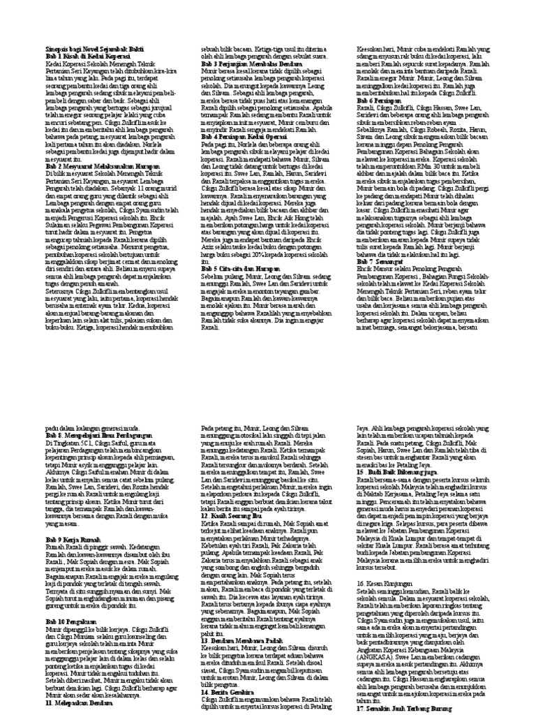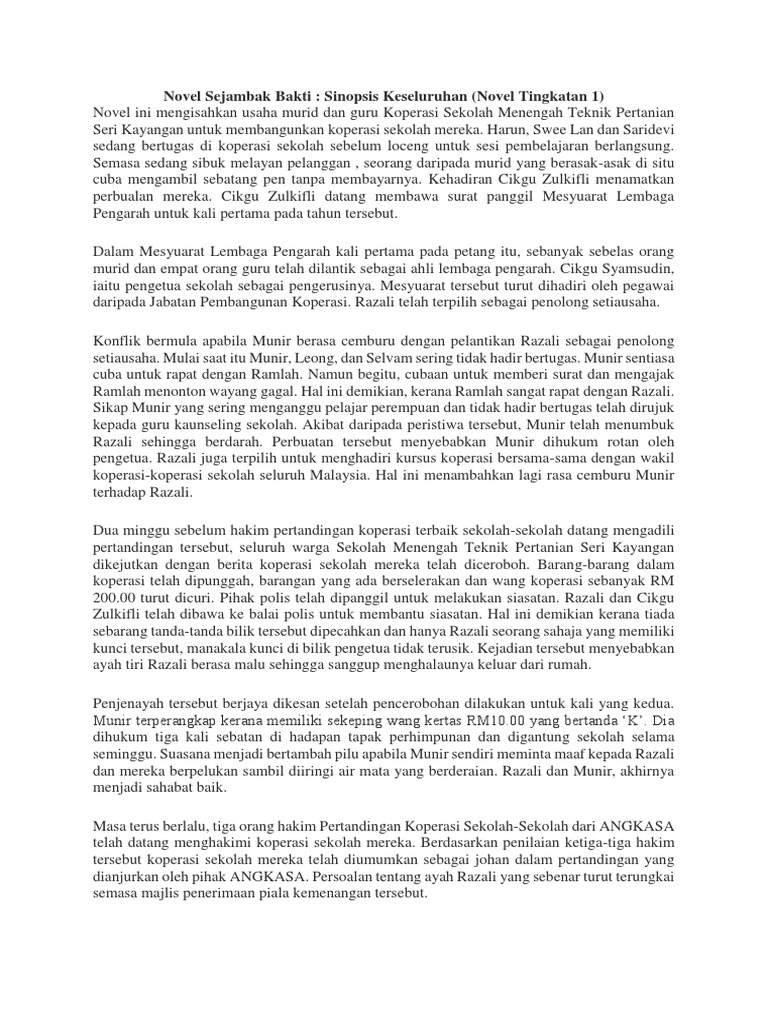 Sinopsis watak dan perwatakan tema persoalan nilai pengajaran latar masa latar tempat. Sinopsis novel sejambak bakti novel ini mengisahkan usaha murid dan guru koperasi sekolah menengah teknik pertanian seri kayangan untuk membangunkan koperasi sekolah mereka. Sinopsis sejambak bakti tingkatan 1 2015 bab 1 10 novel sejambak bakti karya rejab f i merupakan novel baharu bagi tingkatan satu zon sabah sarawak wilayah persekutuan labuan dan johor bermula dari tahun 2015. Sinopsis novel tingkatan 1 sejambak bakti sinopsis bagi novel sejambak bakti.