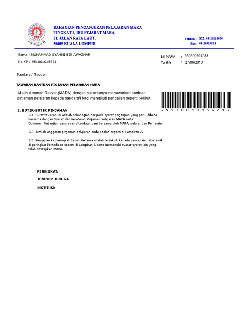 Pinjaman ini dibuka bagi pemohon yang akan mengikuti pengajian ke peringkat diploma sarjana muda dan sarjana di institusi pendidikan tinggi tempatan dalam bidang bidang utama keperluan pembangunan negara. Majlis amanah rakyat mara sebuah agensi kementerian pembangunan luar bandar ditubuhkan pada 1 mac 1966 di bawah akta parlimen sebagai sebuah badan berkanun hasil daripada resolusi kongres ekonomi bumiputera pertama pada tahun sebelumnya. Tetapi pemohon perlu kemukakan seorang penyokong referee di kalangan keluarga terdekat. Mara menyediakan pinjaman pendahuluan bagi pelajar yang ingin melanjutkan pelajaran sebanyak rm1500 rm2000 bagi pelajar yang layak.