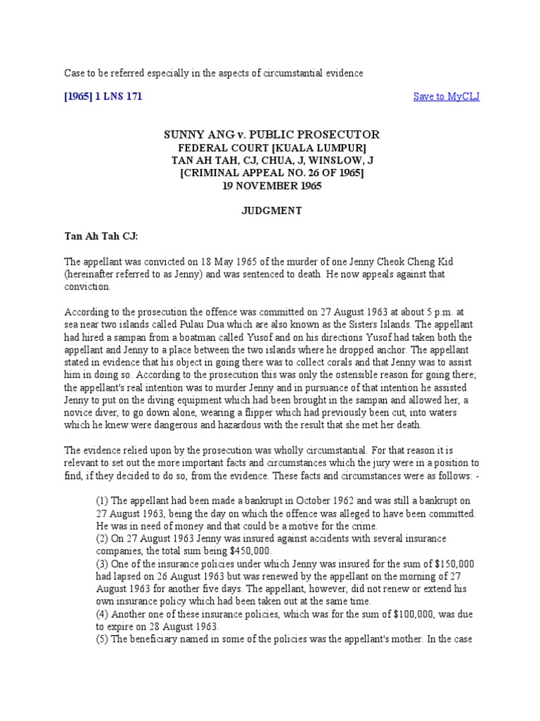 Sunny ang v pp. In the case of sunny ang v pp 1967 2 mlj 195 the appellant was charged and convicted of the murder of his girlfriend despite the fact that the body of the deceased was never discovered. Sunny ang v pp. A review take the circumstances in the sunny ang case in the context of the malaysian penal code and judiciary system as it is today. Her body was never found.