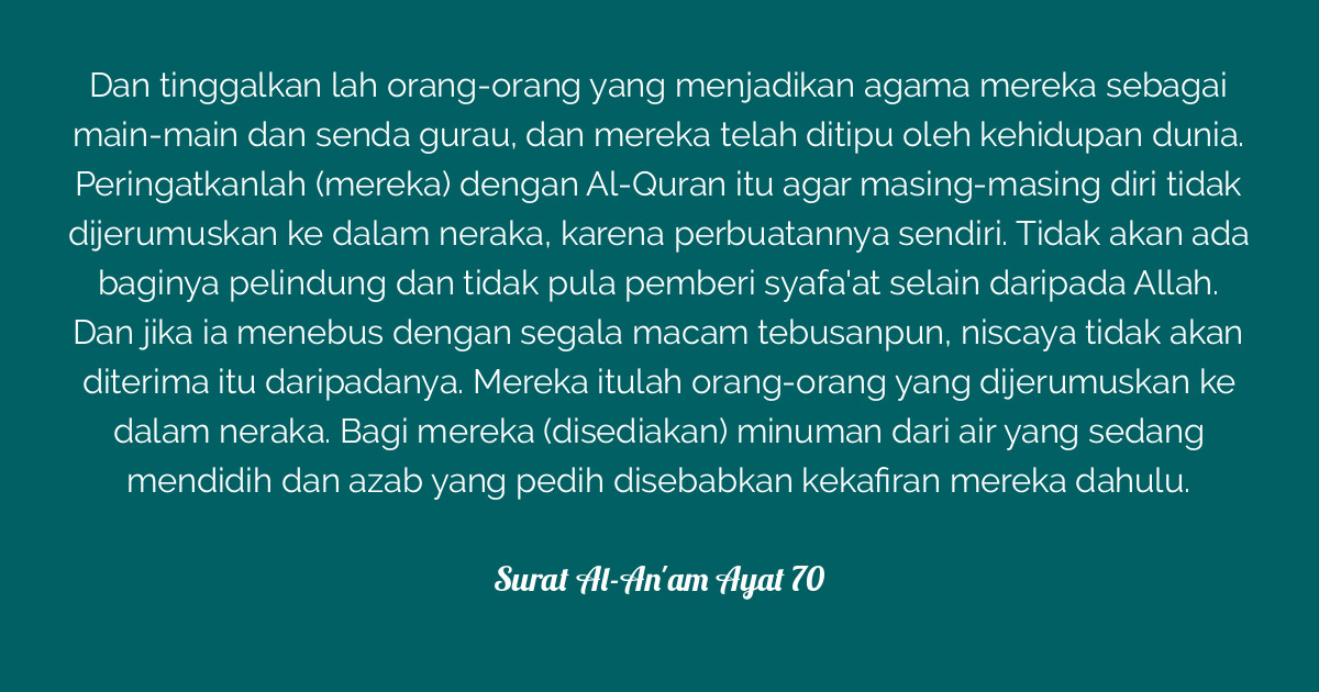 Surah al an am ayat 70. 70 memahami isi kandungan al qur an surat al an am ayat 70. Peringatkanlah mereka dengan al qur an itu. 70 yakni berilah peringatan kepada manusia dengan al qur an ini dan pertakutilah mereka agar mereka ingat akan pembalasan allah dan azab nya yang pedih kelak di hari kiamat. Verse no 70 of 165 arabic text urdu and english translation from kanzul iman next verse.