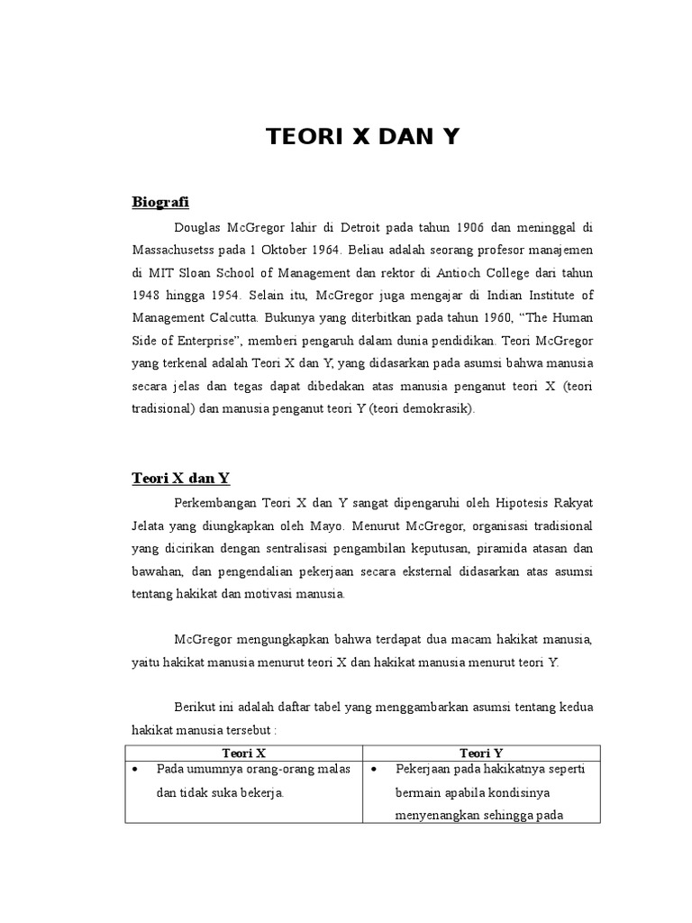 Teori x dan y. Theory x and theory y are theories of human work motivation and management. Academia edu is a platform for academics to share research papers. Teori prilaku adalah teori yang menjelaskan bahwa suatu perilaku tertentu dapat membedakan pemimpin dan bukan pemimpin pada orang orang. Teori x dan teori y menurut douglas mcgregor gaya manajemen suatu perusahaan sangat dipengaruhi oleh keyakinan dan asumsi manajemennya terhadap apa yang merupakan dorongan kerja karyawannya.