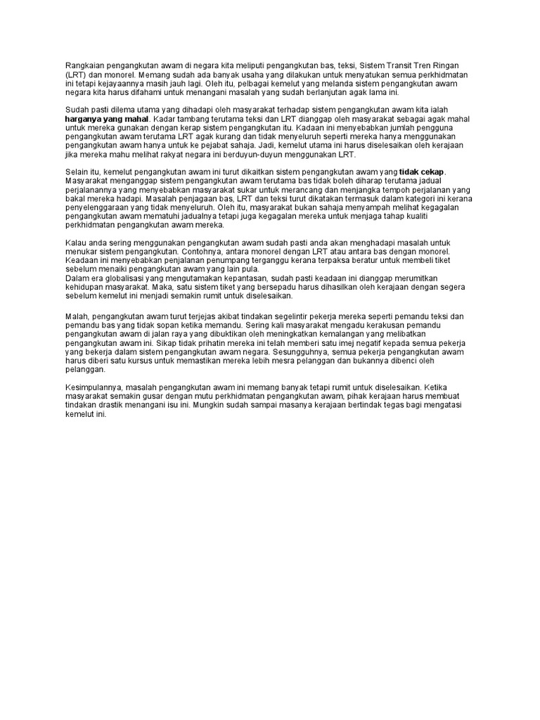 Selain daripada perlu memberi isi isi penting yang berkaitan pelajar juga perlu menghurai dengan gaya bahasa yang menarik serta betul dari segi penggunaan bahasanya sebagai panduan berikut dikongsikan contoh karangan kebaikan menggunakan pengangkutan awam. Sekiranya perkara tersebut masih terus didiamkan tanpa sebarang tindakan kita bimbang hasrat kerajaan untuk menjadikan pengangkutan awam sebagai salah satu pengangkutan utama di negara kita akan terkubur. Pencemaran udara penggunaan diesel oleh pengangkutan seperti bas menghasilkan jelaga hitam semasa pelepasan asap dari ekzos. Antara masalah masalah sistem pengangkutan di malaysia yang sering dihadapi dan dialami oleh pengguna adalah.